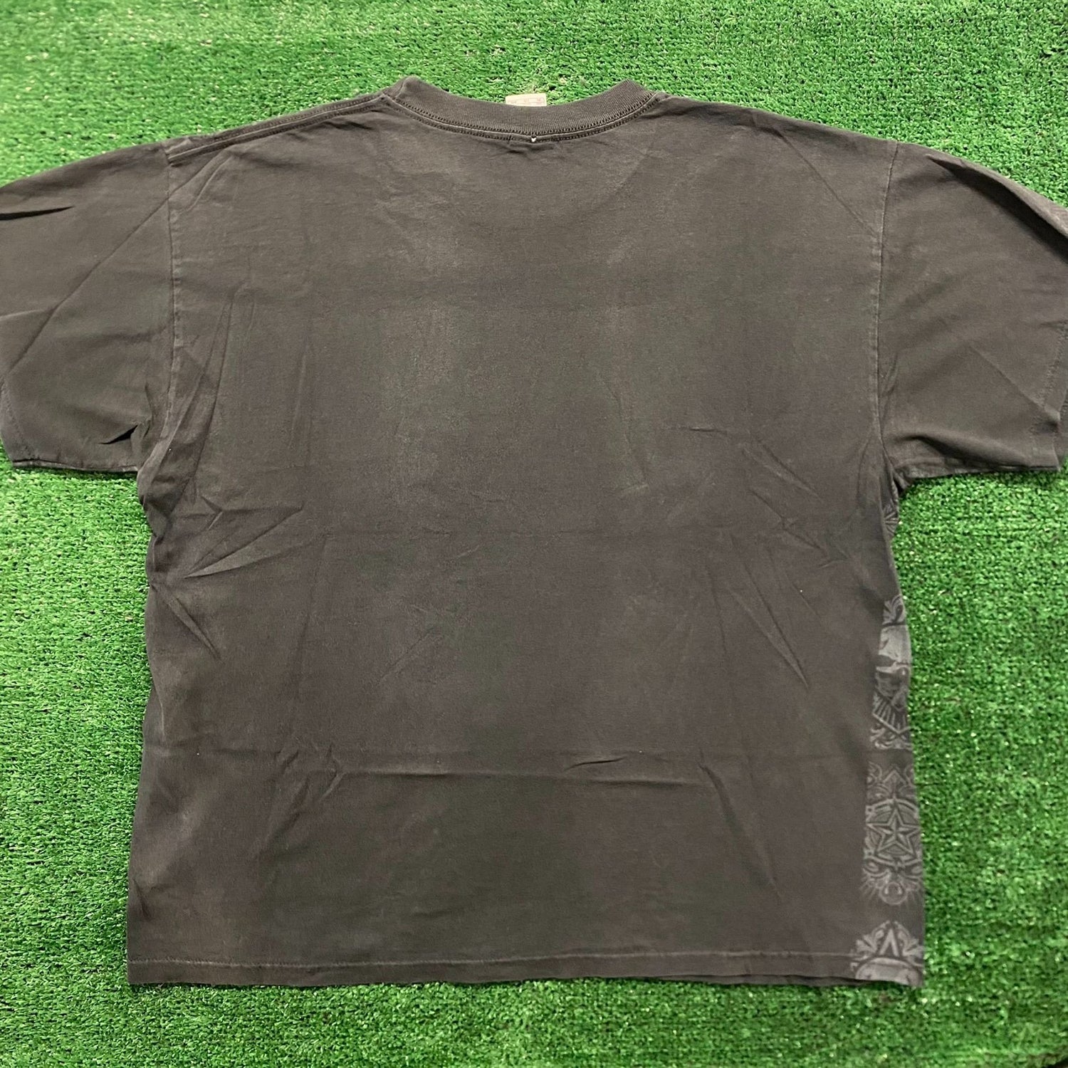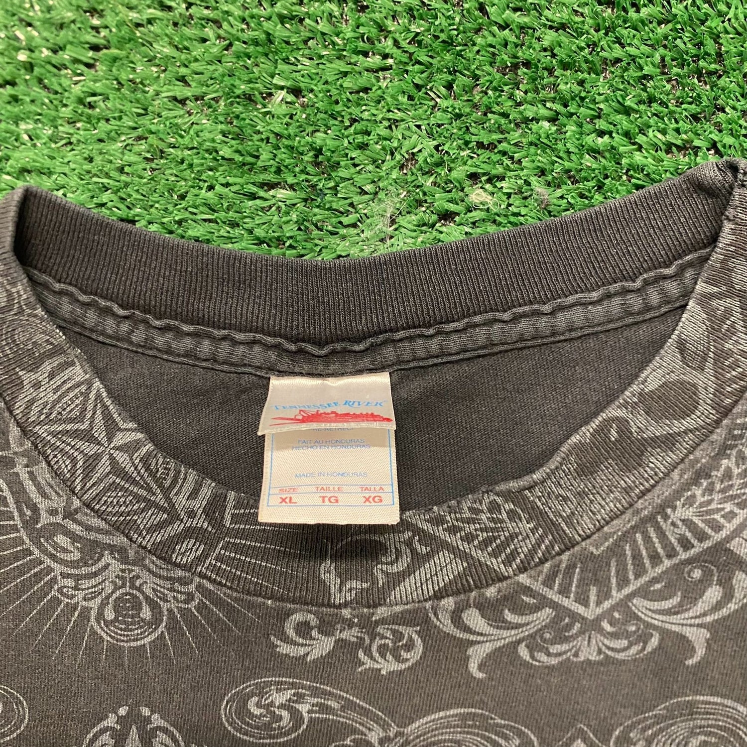 Sun faded black short sleeve crewneck t-shirt by Tennessee River with Gothic bandana skulls and crossed daggers all over front print graphic. Boxy oversized fit.